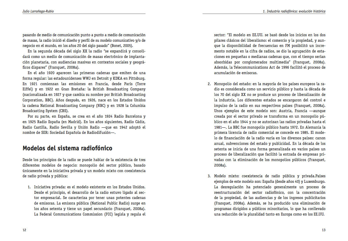 Este libro es una aproximación a la industria radiofónica española. En él se refleja el estado de la cuestión de acuerdo con los análisis de diferentes autores sobre diversos aspectos económicos de este medio de comunicación. En primer lugar, se efectúa un recorrido por la evolución histórica de la industria de la radio, atendiendo a sus orígenes y a los modelos hegemónicos de comunicación radiofónica. A continuación, se aborda la economía de la radio desde diversos puntos de vista: el producto radiofónico, los modelos de radio generalista o especializada, las cadenas y redes o la estructura del sector en España. Seguidamente, se estudia la publicidad, la audiencia y el consumo de radio en nuestro país, para abordar, finalmente, los principales modelos de radio: la comercial, la pública, la comunitaria y, sobre todo, la digital, que ha supuesto una auténtica revolución tecnológica y económica en el medio radiofónico.