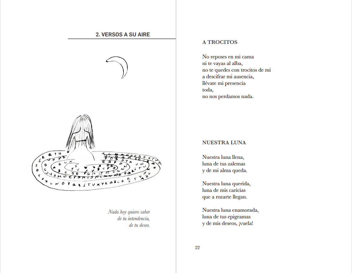 La segunda parte, "Versos a su aire", se quiere más libre y más bisoña, la métrica no importa, la rima tampoco, son romances que a veces se desdicen, se interrogan, se cantan, se recitan con furia.