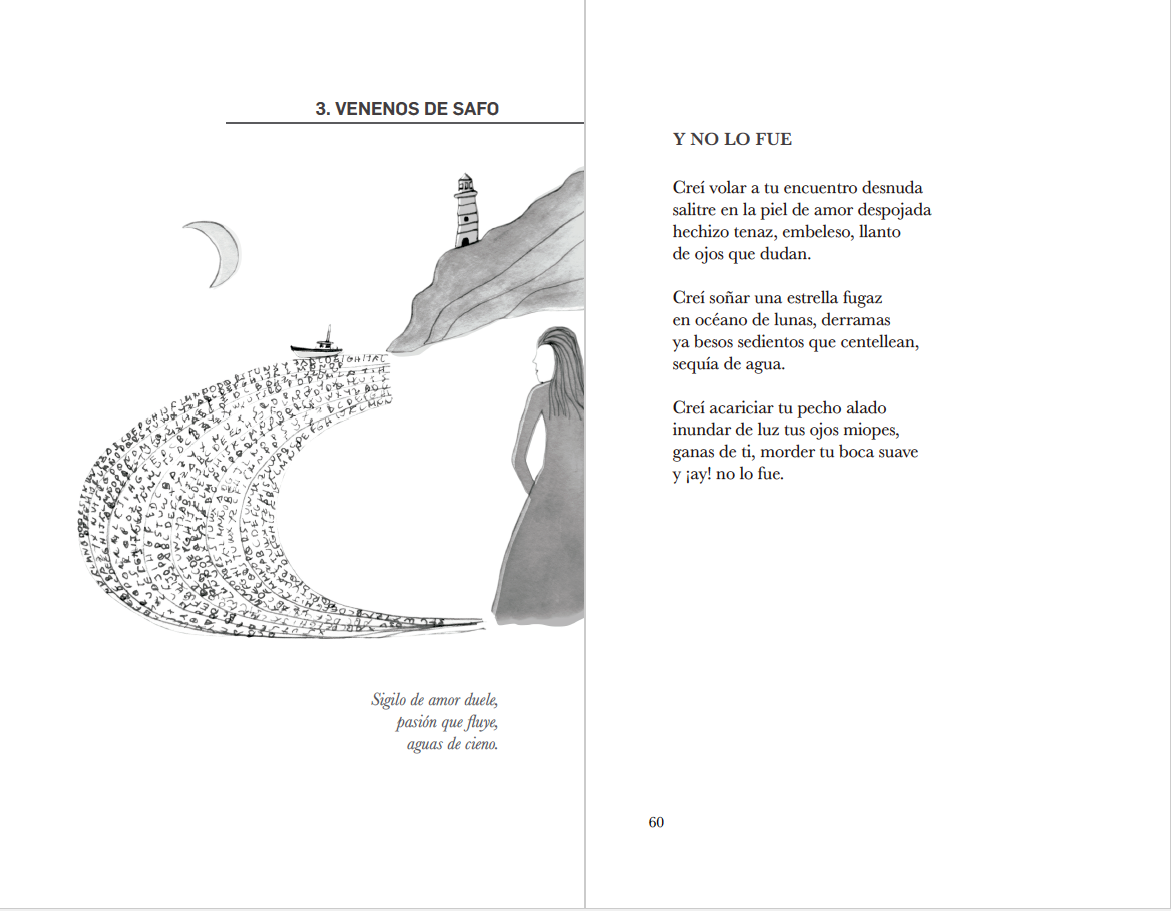 La tercera parte, "Versos de Safo", se pretende una oda a las estrofas sáficas, pero tal vez no lo sea tampoco. Son poemas escritos desde el más puro inconsciente, a través del veneno de la escritura, el veneno del desgarro poético, el veneno del amor.